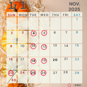 11月の予定 11月は23日日曜日 都合によりお休みいたします。 七五三受付します。 まだまだ暑い中ですが、ご予約お待ちしております。 お問い合わせはHPよりメール、お電話にてお願いいたします。 9月の予定 9月の予定で […]