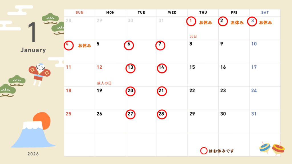 明けましておめでとうございます。本年もよろしくお願いいたします。1月は5日より平常営業です。